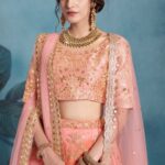 Design: Peach Sequin and Floral Embroidery Lehenga Choli with Pink Net Dupatta