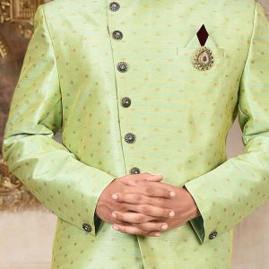 Design: Beige Jacquard Sherwani with Pants and Brooch