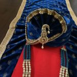 Description: Men’s Pearl Mala with Rhinestone Pieces and Blue Beads, Blue Velvet Safa and Blue Velvet Stole with tassels and Gold Print