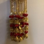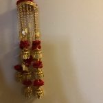 Design: A Pair of Kaleera with Red Flowers decorating the top and in between levels of the kaleera with gold leaves hanging