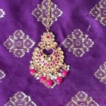 Description: Gold and Red Kundan Necklace Set  with Mang Tikka and Earrings
