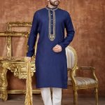 Navy Blue Heavy Art Silk Men’s kurta Pajama Set Kurta: Navy Blue Heavy Art Silk Pajama: Off White Cotton Bottom: (Chudidar Style) Fabric: Heavy Art Silk and Cotton Care: First Wash, Dry clean