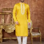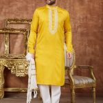 Yellow Heavy Art Silk Men’s Kurta Pajama Set Kurta: Yellow Heavy Art Silk Pajama: Off White Cotton Bottom:(Chudidar Style) Fabric: Heavy Art Silk and Cotton Care: First Wash, Dry Clean
